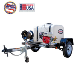 This powerful SIMPSON® cold water mobile pressure washing system will handle all your commercial jobs. It is perfectly suited for contract cleaners, mobile detailers, municipalities, and resorts. The trailer is dot certified as an over-the-road pressure washer system. Job-Site set-up is a snap. Pull up to the work area, connect the spray gun, start the engine and begin cleaning. Equipped with a (49-State compliant) HONDA® engine and reliable CAT PUMPS® triplex pump.