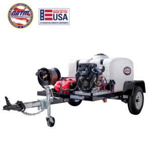 This powerful SIMPSON® cold water mobile pressure washing system will handle all your commercial jobs. It is perfectly suited for contract cleaners, mobile detailers, municipalities, and resorts. The trailer is dot certified as an over-the-road pressure washer system. Job-Site set-up is a snap. Pull up to the work area, connect the spray gun, start the engine and begin cleaning. Equipped with a (49-State compliant) VANGUARD® V-twin engine with an electric start and reliable CAT PUMPS® triplex pump.