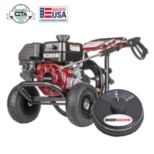 Clean big with the Clean Machine® by SIMPSON®! This fully assembled compact gas pressure washer is lightweight, easy to store, and provides a powerful pressure washing experience. Just set up and you are ready to clean. The Clean Machine features a (50-State compliant) KOHLER® SH Series engine paired with AAA® AX300 Pro Axial pump with patent-pending PowerBoost® Technology provides higher pressure at the nozzle resulting in greater impact and cleaning performance. The pressure washer steel frame is powder-coated for corrosion resistance. This compact gas-pressure washer will allow easy access to hard-to-clean areas.