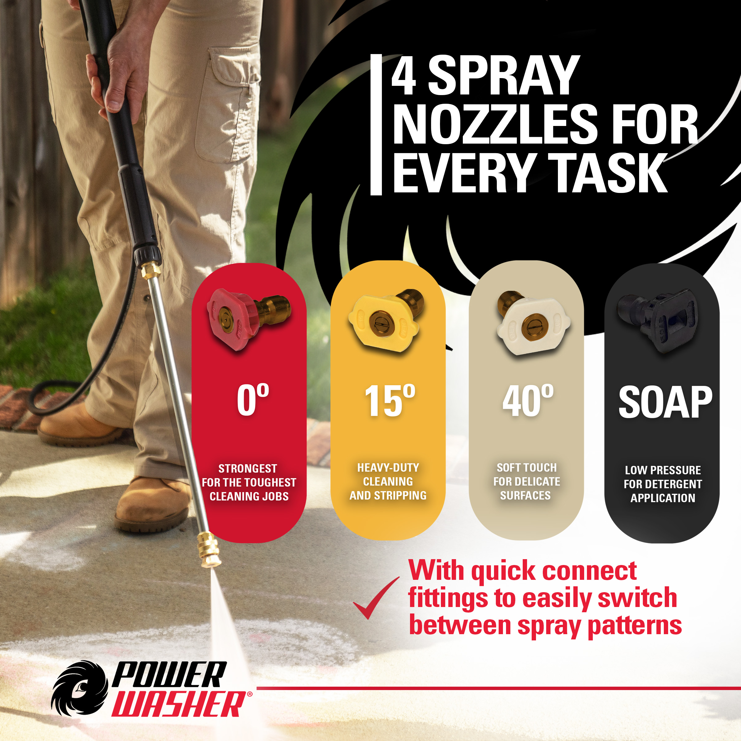 - 4 quick connect nozzle tips, 0°, 15°, 40° and soap nozzle to use for a variety of cleaning applications