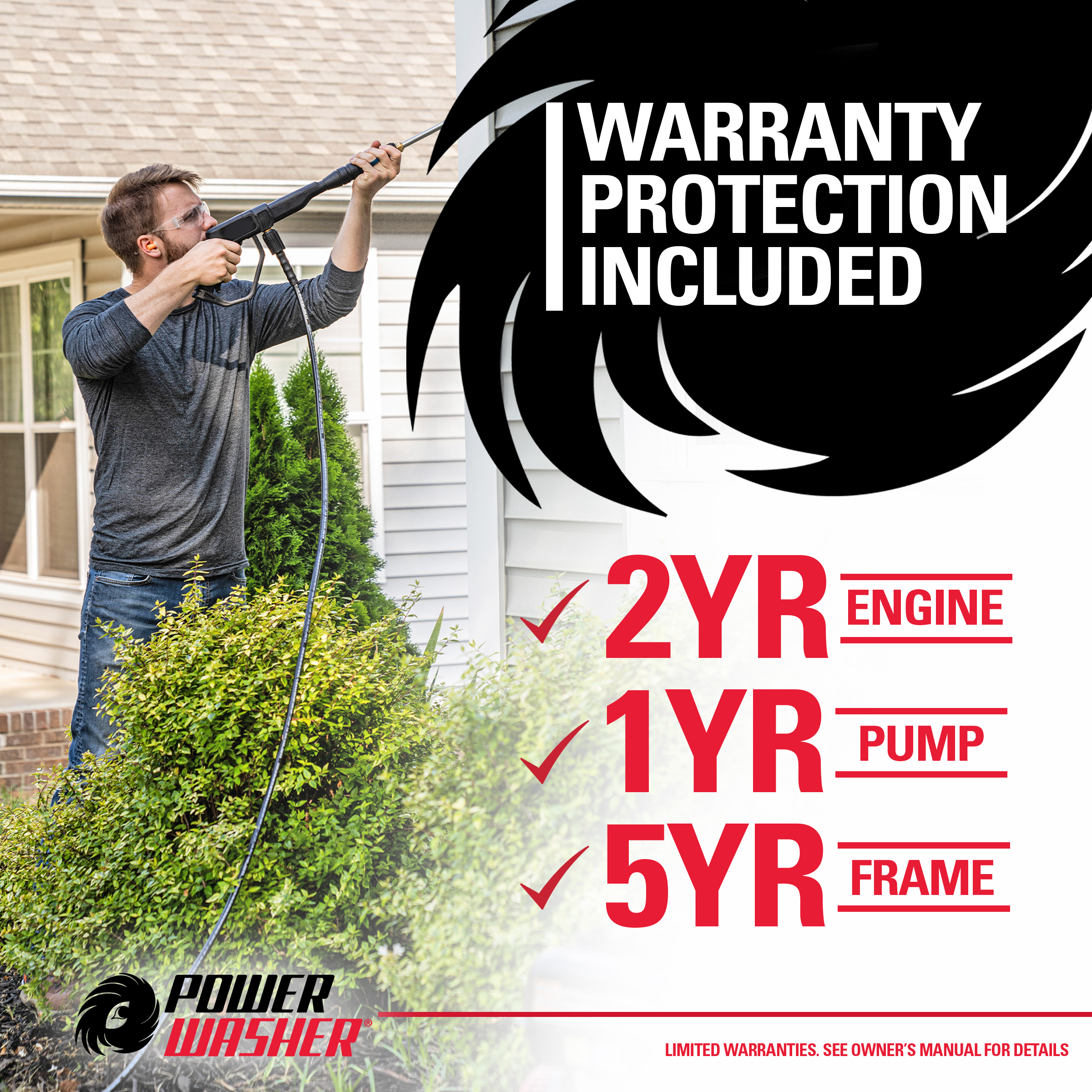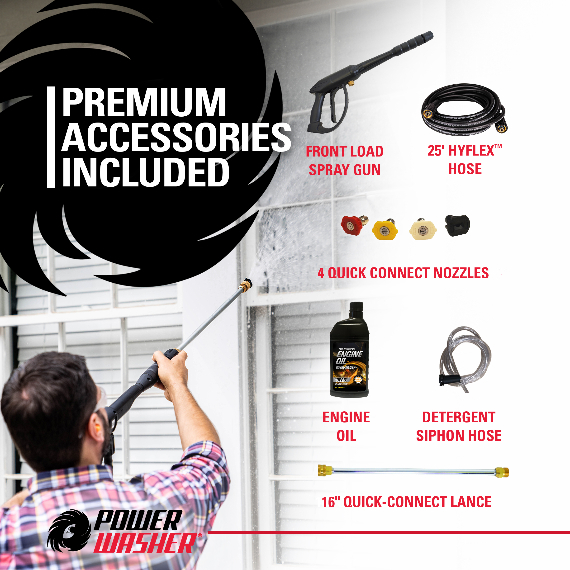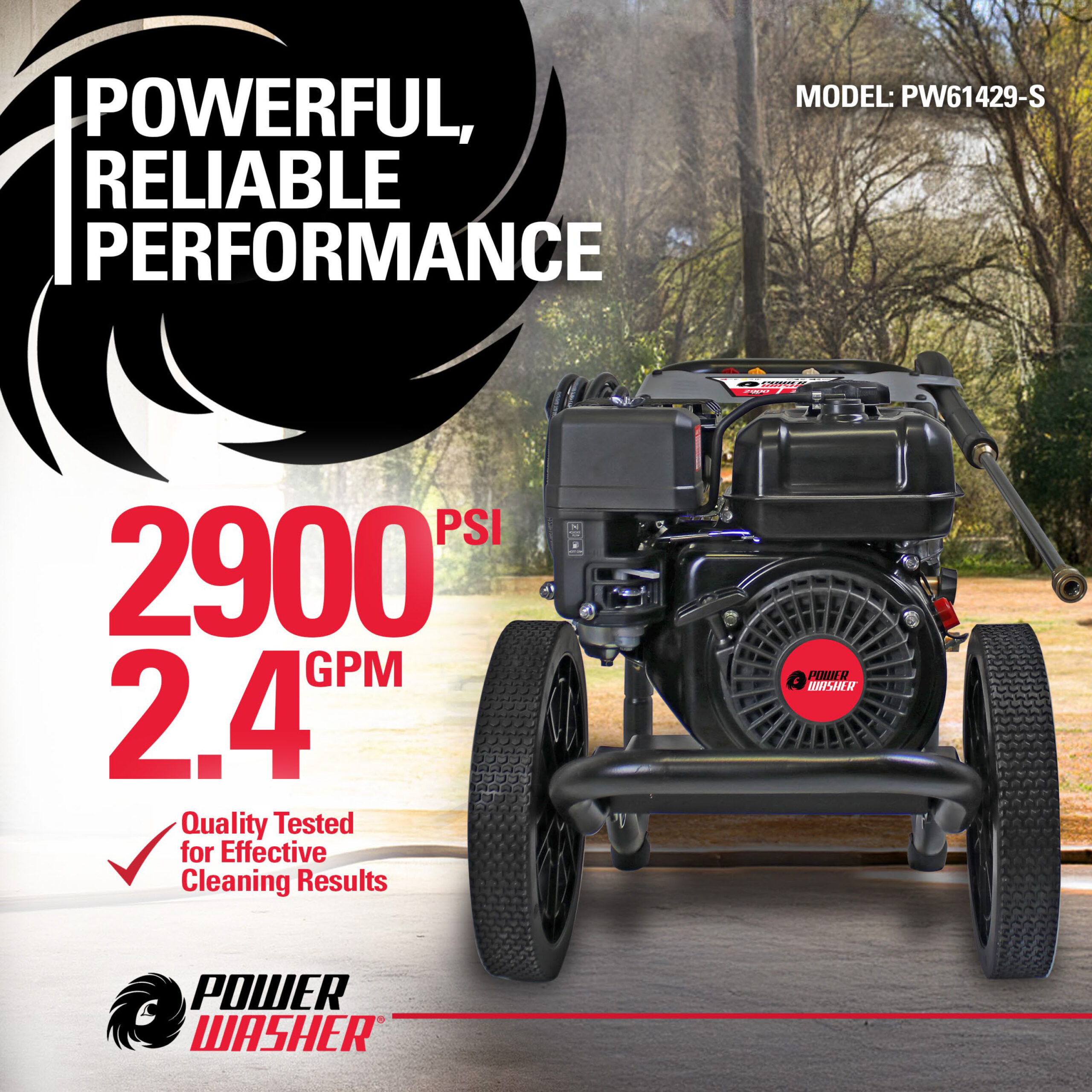 Tackle everyday cleaning jobs with ease. The Powerwasher 2900 PSI is the perfect choice for homeowners who want reliable performance without breaking the budget. From patios and decks to cars, outdoor furniture, and siding, this lightweight unit delivers powerful cleaning results. A dependable 159cc engine and maintenance-free axial pump ensure smooth operation, while the compact hand-truck frame and never-flat wheels make it easy to move around your property. With 4 quick-connect nozzles and a 25 ft. high-pressure hose, you’ll have just the right spray for every task. Simple to start and effortless to use, it’s a great all-around washer for the DIYer looking for value and convenience.