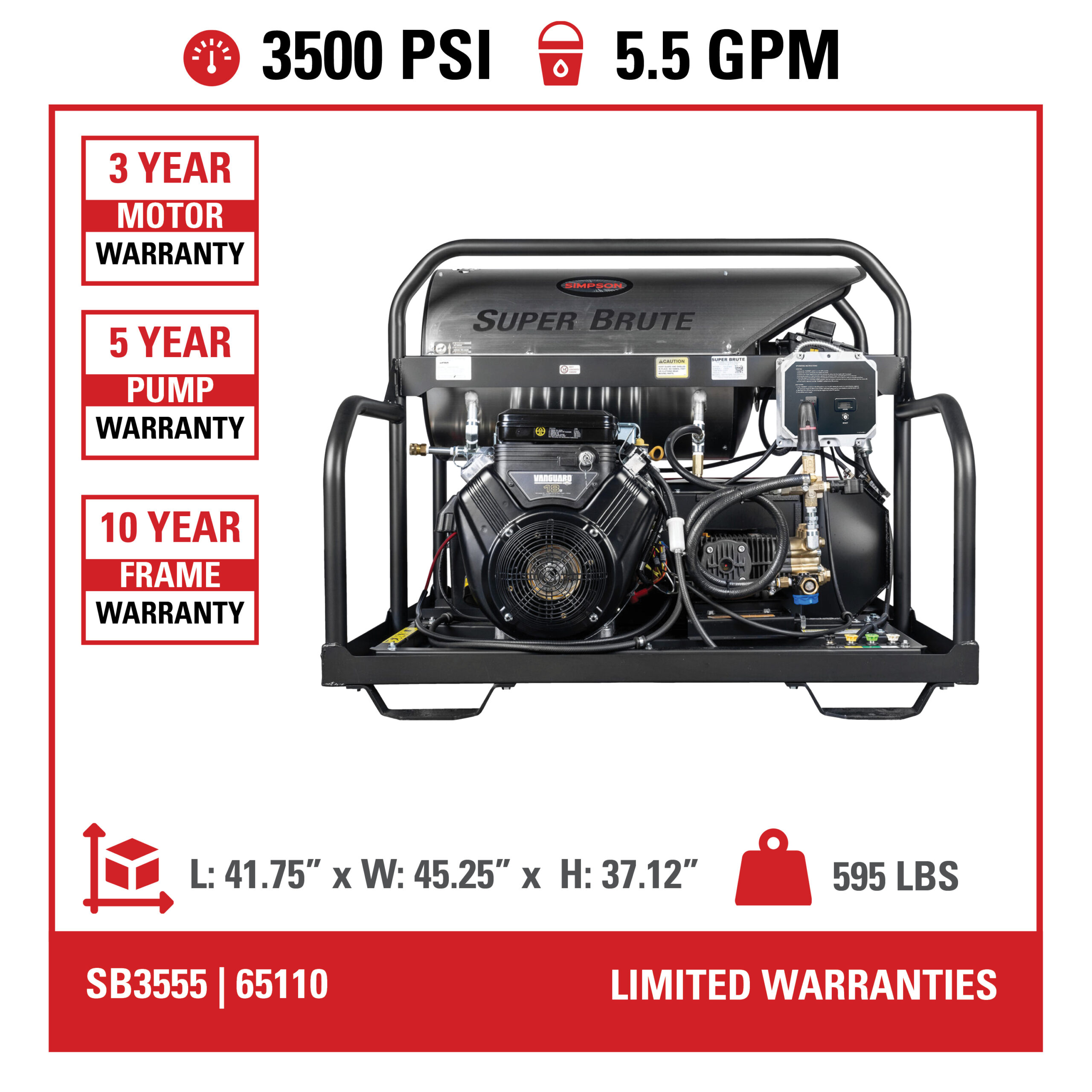 The SIMPSON® Super Brute SB3555 offers an enhanced cleaning experience that provides maximum power and efficiency. Equipped with (49-State compliant) VANGUARD® engine and premium COMET industrial triplex plunger pump with safety relief valve and bypass hose.