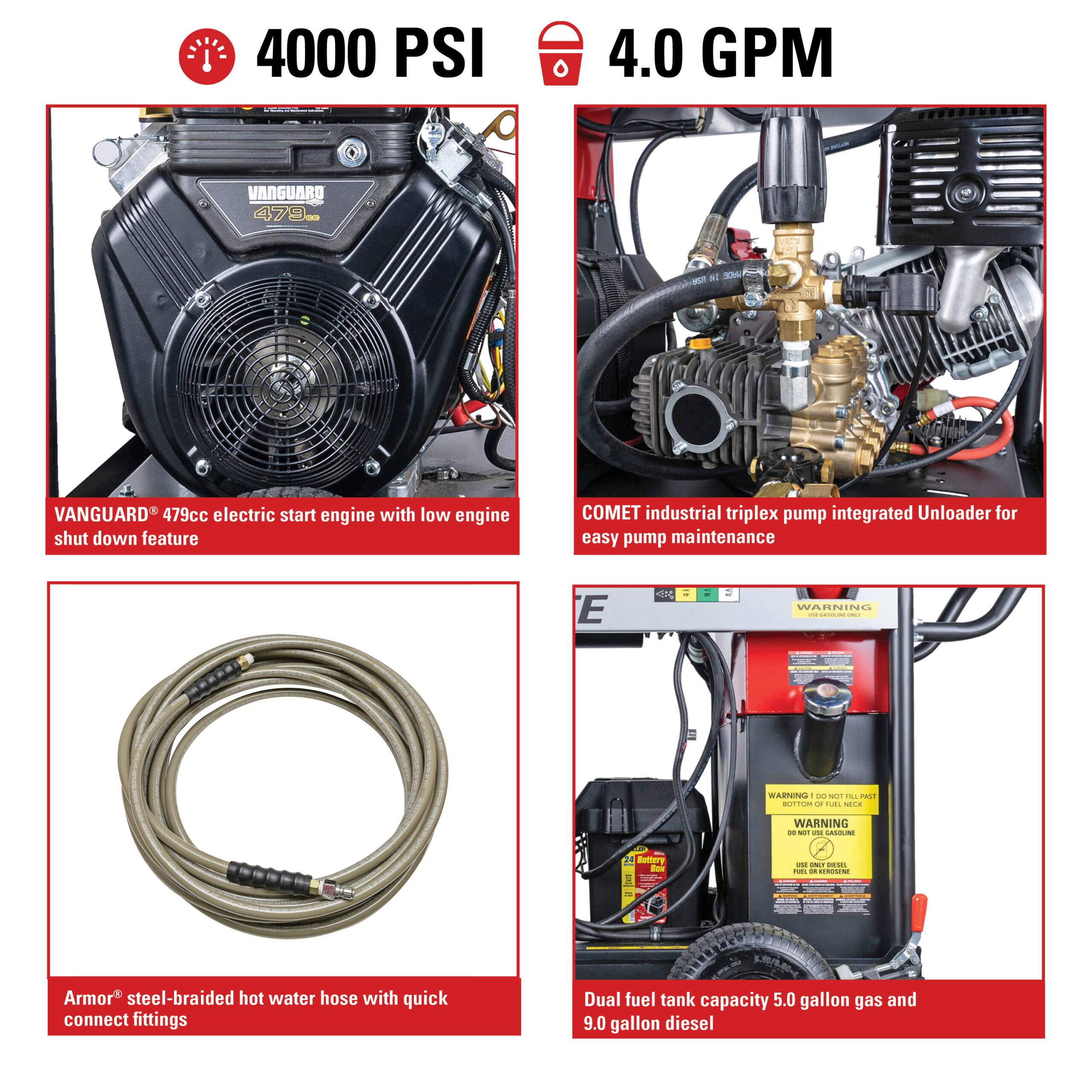 The SIMPSON® Big Brute BB65105 offers an enhanced cleaning experience that provides maximum power and efficiency. Equipped with a (49-State compliant) VANGUARD® V-twin engine and premium COMET industrial triplex plunger pump with safety relief valve and bypass hose.