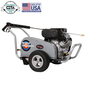 The WS4050V Water Shotgun is easy to use and designed for the deepest of cleaning. Perfect for paint preparation, professional cleaning services, graffiti removal, industrial job sites, and fleet maintenance. Equipped with a (49-State compliant) VANGUARD® engine with an electric start. The heavy-duty COMET industrial triplex plunger pump is designed with ceramic pistons and a thermal relief valve for long life. Its dual-belt system separates the engine and pump, preventing overheating and pump fatigue, resulting in greater efficiency and greater longevity in the engine and pump life.